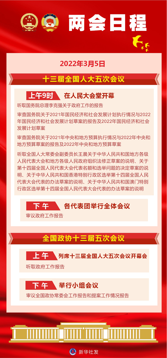 新華社北京3月4日電 十三屆全國人大五次會議5日上午9時(shí)在人民大會堂開幕,聽取國務(wù)院總理李克強(qiáng)關(guān)于政府工作的報(bào)告,審查國務(wù)院關(guān)于2021年國民經(jīng)濟(jì)和社會發(fā)展計(jì)劃執(zhí)行情況與2022年國民經(jīng)濟(jì)和社會發(fā)展計(jì)劃草案的報(bào)告及2022年國民經(jīng)濟(jì)和社會發(fā)展計(jì)劃草案,審查國務(wù)院關(guān)于2021年中央和地方預(yù)算執(zhí)行情況與2022年中央和地方預(yù)算草案的報(bào)告及2022年中央和地方預(yù)算草案,聽取全國人大常委會副委員長王晨關(guān)于中華人民共和國地方各級人民代表大會和地方各級人民政府組織法修正草案的說明、關(guān)于第十四屆全國人民代表大會代表名額和選舉問題的決定草案的說明、關(guān)于中華人民共和國香港特別行政區(qū)選舉第十四屆全國人民代表大會代表的辦法草案的說明、關(guān)于中華人民共和國澳門特別行政區(qū)選舉第十四屆全國人民代表大會代表的辦法草案的說明。下午,各代表團(tuán)舉行全體會議,審議政府工作報(bào)告。