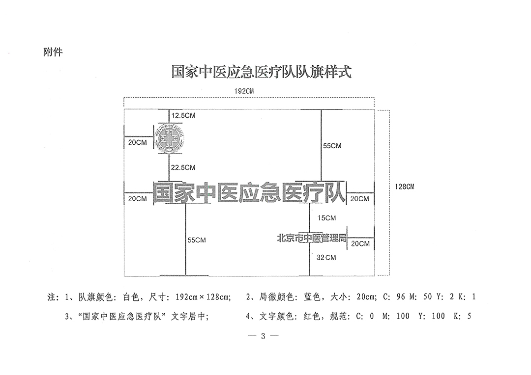 三、醫療隊要按照國家中醫藥管理局統一要求制作隊旗,隊旗第一行為國家中醫藥管理局局徽圖案,第二行為“國家中醫應急醫療隊”字樣,第三行為醫療隊所在省(區、市)中醫藥管理局或國家中醫藥管理局直屬(管)單位名稱;隊旗為白色,局徽為藍色,文字為紅色。具體樣式見附件。