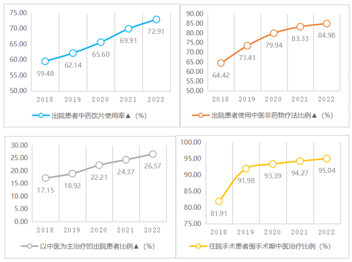 二是中醫藥服務能力持續提升。2022年,全國三級公立中醫醫院門診和住院患者分別為4.51億人次、1528.86萬人次,較2021年分別增加31.98個和3.81個百分點。理法方藥使用一致的出院患者比例穩定在88%左右;優質護理服務病房覆蓋率為99.43%,與2021年相比提高1.37個百分點。