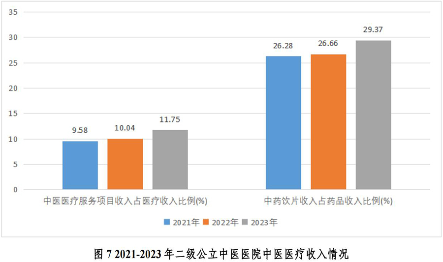 在中醫醫療收入方面。2023年,全國二級公立中醫醫院中醫醫療服務項目收入(不含中藥收入)占醫療收入比例為11.75%,較2022年提升1.71個百分點;中藥飲片收入占藥品收入比例為29.37%,較2022年增長2.71個百分點(見圖7)。