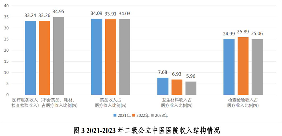 二是持續推進體現以醫療服務為主導的價格改革,收支結構不斷優化。2023年,全國二級公立中醫醫院醫療服務收入(不含藥品、耗材、檢查檢驗收入)占醫療收入比例為34.95%,較2022年提升1.69個百分點,衛生材料、檢查檢驗收入占醫療收入比例分別為5.96%和25.06%,較2022年下降0.97、0.83個百分點,藥品收入占醫療收入比例基本保持穩定(見圖3)。其中重點監控高值醫用耗材收入占比為24.89%,較2022年下降6.86個百分點。