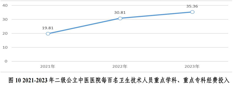 二是人才培養和重點學科、重點專科建設經費投入逐年增長。2023年,二級公立中醫醫院人才培養經費投入總金額為5.6億,較2022年增加26.08%,人才培養經費投入占比為0.31%,較2022年增長0.06個百分點;每百名衛生技術人員重點學科、重點??平涃M投入為35.36萬元,較2022年增加4.55萬元(見圖10)。二級公立中醫醫院不斷增加人才培養及重點學科、重點??平涃M投入,為推進中醫藥人才隊伍建設和中醫優勢??平ㄔO創造條件。