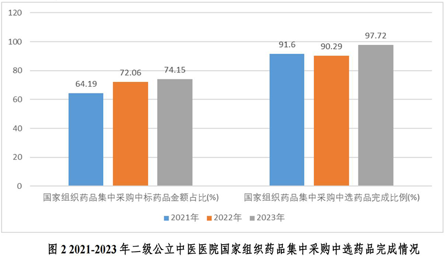 一是積極推進藥品集中采購,完善醫療、醫保、醫藥協同機制。2023年,全國二級公立中醫醫院國家組織藥品集中采購中標藥品金額占比和中選藥品完成比例分別為74.15%、97.72%,較2022年增加2.09、7.43個百分點(見圖2)。