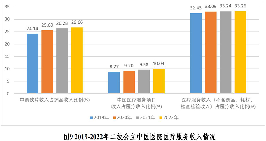 三是中醫藥服務收入占比不斷提高。2022年,全國二級公立中醫醫院中醫醫療服務項目收入(不含中藥收入)占醫療收入比例為10.04%,較2021年提高0.46個百分點;中藥飲片收入占藥品收入比例為26.66%,較2021年提高0.38個百分點(見圖9)。中醫醫療服務項目收入占比和中藥飲片收入占比持續提升,中醫藥診療服務優勢和積極性在二級公立中醫醫院進一步得到彰顯。