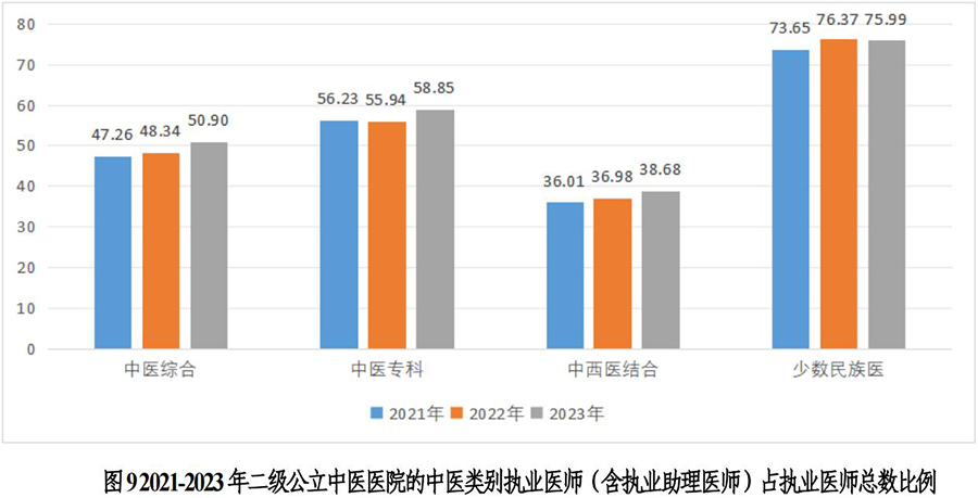 一是專業技術人員結構不斷優化。2023年,全國二級公立中醫醫院的中醫類別執業醫師(含執業助理醫師)占執業醫師總數比例為51.73%,較2022年提升2.43個百分點,中醫綜合醫院、中醫??漆t院、中西醫結合醫院的中醫類別醫師占比分別為50.90%、58.85%、38.68%,較2022年增長2.56、2.91、1.70個百分點(見圖9)。此外,重癥、病理、感染性疾病科醫師數量和占比均較2022年有一定增長,重癥、病理、感染性疾病科醫師等急需緊缺專業人才隊伍逐步壯大。