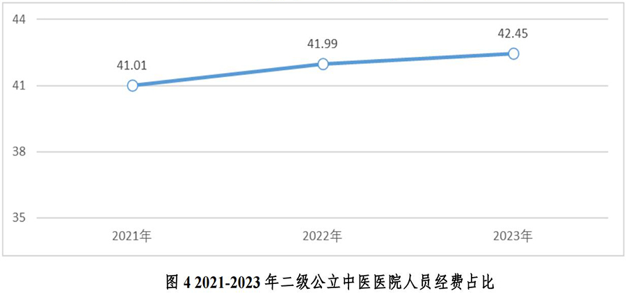三是進一步推動中醫醫院薪酬制度改革,人員經費逐步提高。2023年,全國二級公立中醫醫院人員經費較2022年提高3.77%,人員經費占比提高至42.45%,較2022年提升0.46個百分點(見圖4),醫務人員技術勞務價值進一步體現。