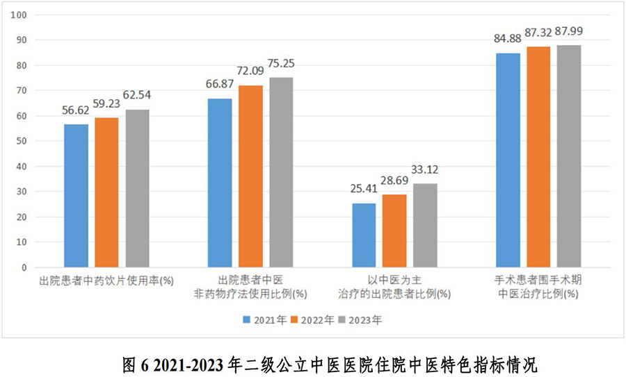 在住院中醫藥服務方面。2023年,全國二級公立中醫醫院出院患者中藥飲片使用率、出院患者使用中醫非藥物療法比例、以中醫為主治療的出院患者比例分別為62.54%、75.25%、33.12%,較2022年分別提高3.31、3.16、4.43個百分點;手術患者圍手術期中醫治療比例為87.99%,較2022年提高0.67個百分點(見圖6)。