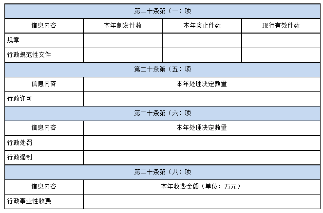 各行政機關年度報告格式模板附后。此前有關政府信息公開的各類報告和統計口徑,隨原政府信息公開條例的失效而失效。政府信息公開工作主管部門負責匯總的本級政府年度報告格式,參照這一格式模板辦理。黨的工作機關加掛行政機關牌子的單位,年度報告內容依據全國政府信息公開工作主管部門發布的有關規定(國辦公開辦函〔2019〕51號)確定,并參照這一格式模板辦理。