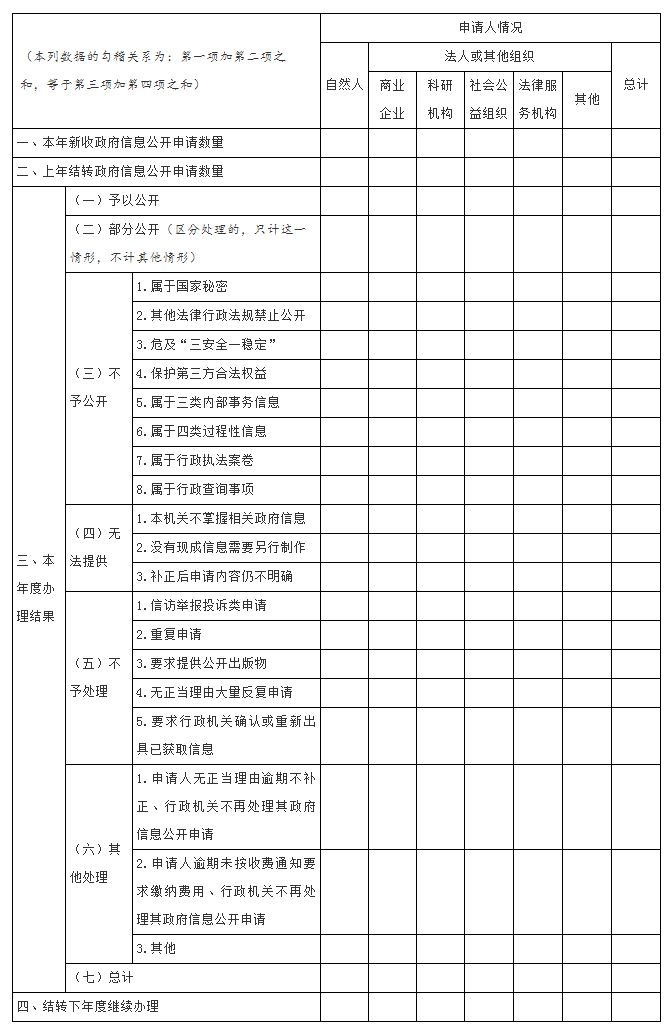 這一項主要報告兩方面情況:一是申請人的類別;二是政府信息公開申請的最終處理結果。此項內容重在數據準確、要素齊備,全面客觀反映政府信息公開申請接收和辦理情況,便于政府信息公開工作主管部門全面掌握工作動態,使社會各界了解政府公開透明進程。